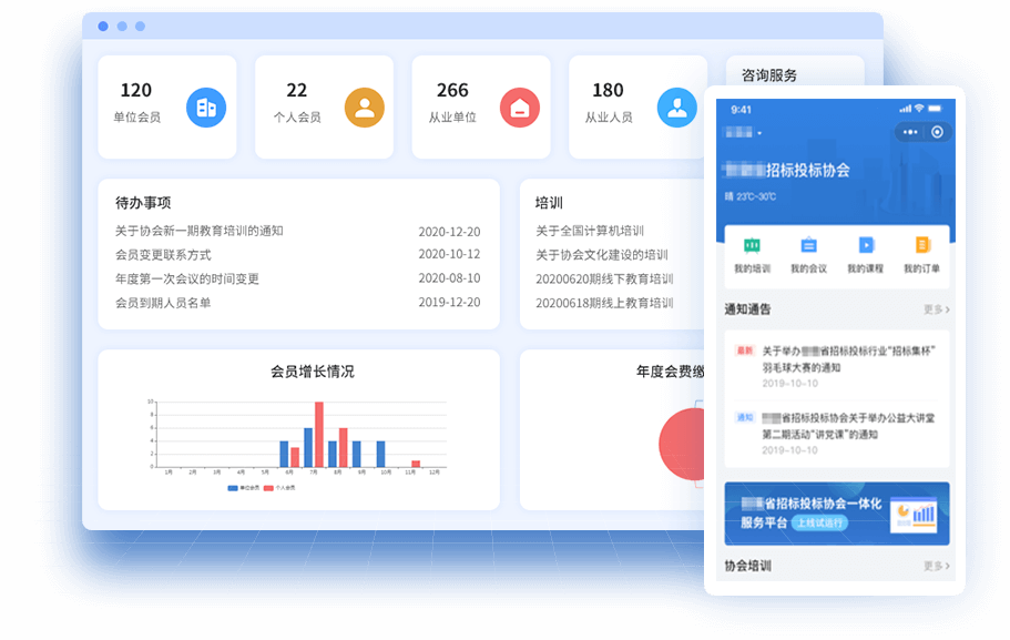 安訊協(xié)會一體化服務平臺,是按照“互聯(lián)網+社會組織”的理念,采用 “云計算、大數(shù)據(jù)”等先進信息技術,立足協(xié)會服務會員、規(guī)范市場秩序、開展行業(yè)自律等需求,建立的一體化管理與服務平臺,集成會員、從業(yè)人員、從業(yè)單位管理,通知、培訓、會議、咨詢、資源、直播服務,以及門戶網站、移動應用,實現(xiàn)協(xié)會各業(yè)務數(shù)字化整合,全面提升各方獲得感,為協(xié)會服務國家、社會、行業(yè)提供全面的信息化支撐。